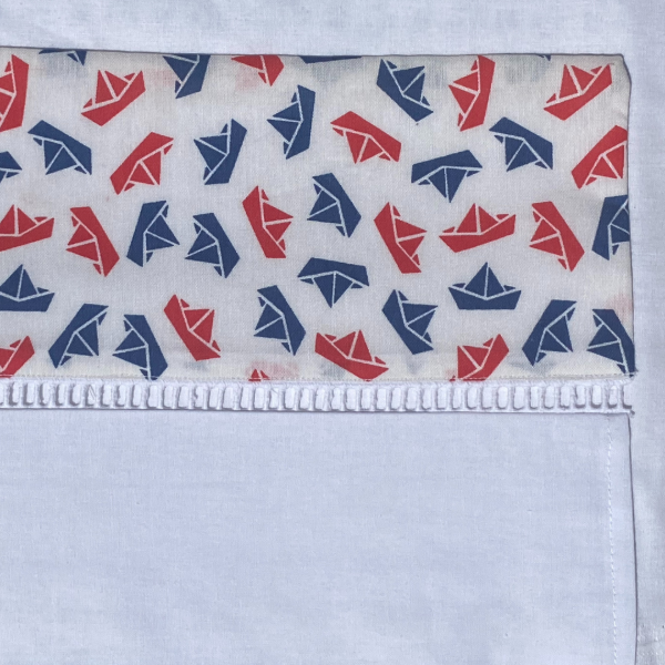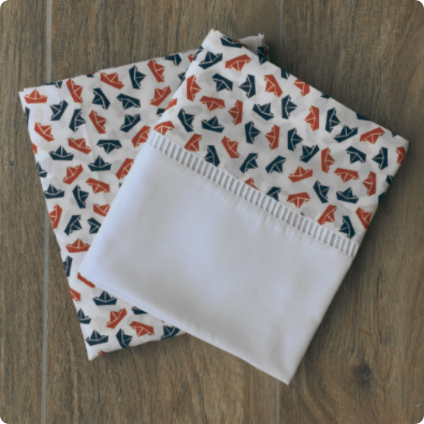 Incluye: sábana ajustable blanca, sábana encimera y funda blanca con bordes estampados.