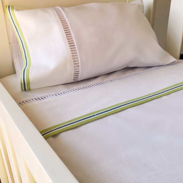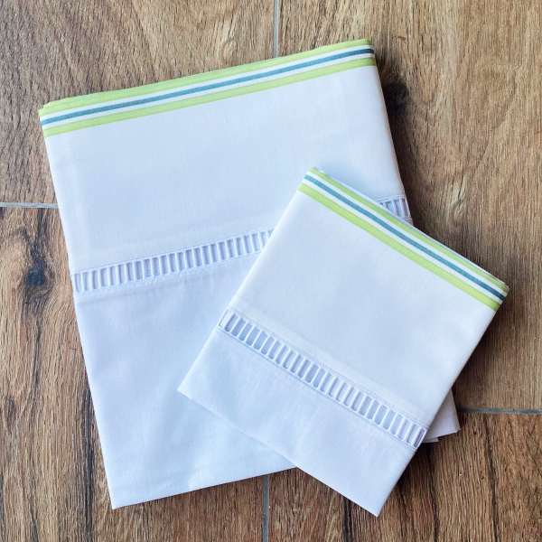 Incluye: sábana ajustable blanca, sábana encimera y funda blanca con bordes estampados.